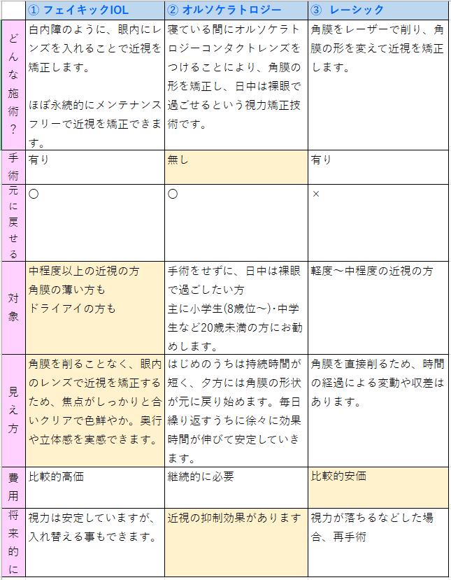 一口に近視治療と言っても、いろいろ違う点がありますね😀